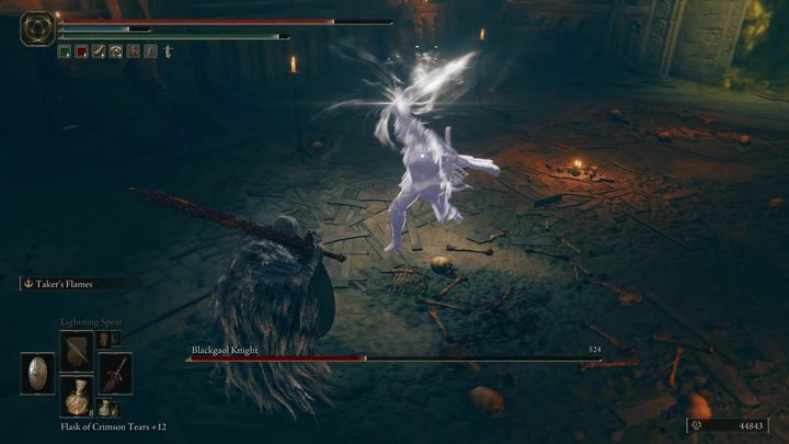 Since the boss fights similarly to the player, he also has access to healing potions. Blackgaol Knight will heal when he loses about half his health. He only has one potion - when you lower his health to a certain level again, he will try to heal himself, but his bottle will be empty. This is the perfect moment to deal a lot of damage, because he will be completely defenseless.