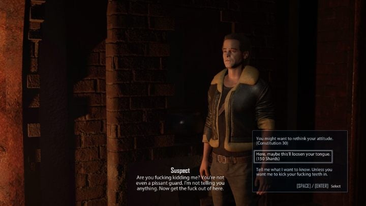 Wulf will offer you to join him on a patrol that starts at night. During the patrol, you will follow Wulf - first you will encounter a character hanging by the window of one of the houses, and then a quarreling couple. Only after reaching the forge will you take an active part in the events. You have to decide how to extract information from the suspect. You can intimidate him (requires 30 Stamina points), bribe him with 150 Elexit crystals or defeat him in combat. Regardless of your choice, the information obtained will not be relevant to the mission objective.