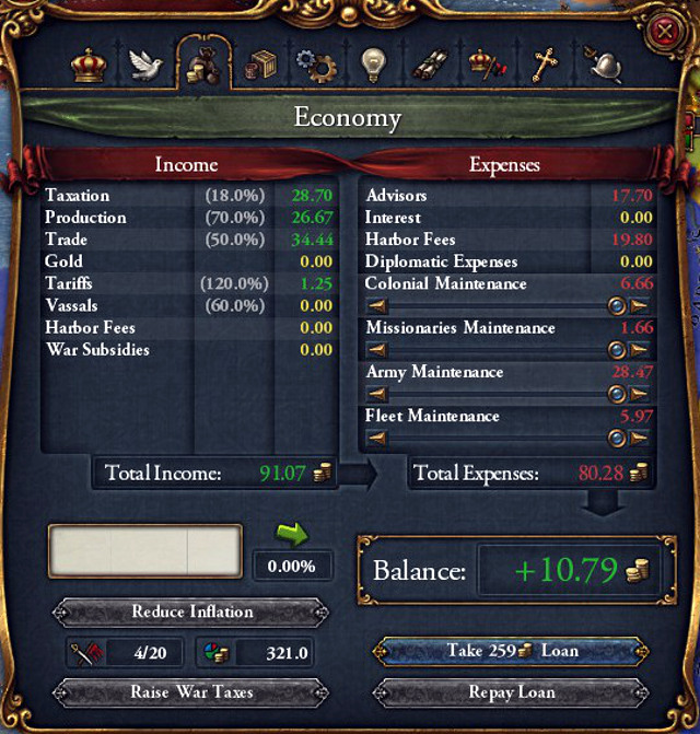 If the country's economy is not capable of dealing with the generated expenses, you need to limit them. First of all, you should turn your attention to the army upkeep slide. In the peacetime, you should keep it somewhere in the middle of the scale and, if you are not likely to experience many problems with rebels, you can cut the expenditures by further 10-15% . In general, if nothing shows that, in the nearest future, you will have to use your army, you should disband much of the existing troops. The second slide that determines how much is spent on the fleet, also may be the source of considerable savings. The situation here, though, is more complicated due to the trade. Light ships are used to protect trade routes and, at the same time, the income generated by these. In this case, cutting their budget may do more damage than it will do good. So, if you use many ships for protection of the trade (which you should) you will have to determine manually how much lower these, to make the savings exceed the potential profits from trade with higher financing of the fleet. Compare both of these values and balance things out to lower the expenses but still receive profits due to the protection of the routes. Still, without mucgh hesitation, you can liquidate heavy galleons, especially if you wage war mainly on land. Of course, in the case of a war, increase both of the slides to their maximum and, look for any financial support in war taxes, loans or in a peace treaty.