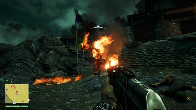 Try to avoid the fire. The entire village is burning and walking into the fire results in taking damage. Look out for Molotov cocktails which will be thrown at you and at the enemies who are throwing them. If you will hit anyone of them he will also start burning and running towards you. Don't let him to catch you and shoot him down fast.