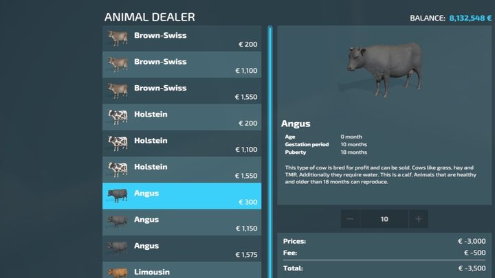 There are 4 species of cows: Brown-Swiss, Holstein, Angus, Limousin. The first two (cheaper) produce milk, however, they gain less value when gaining weight. So you can decide whether you prefer to make money from milk production or "cow production" (the "meat" type does not produce milk).