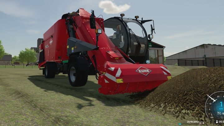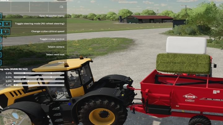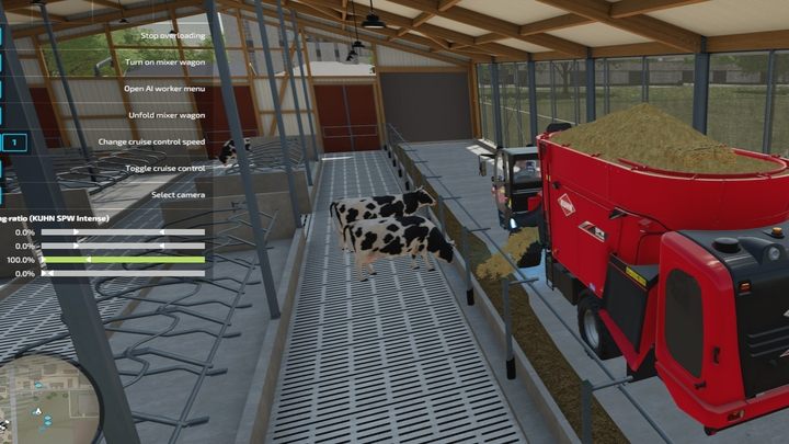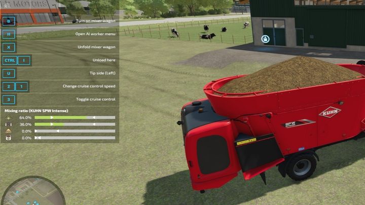 You must fill the trailer or vehicle with hay and chaff in the appropriate proportions, as shown in the window on the left when you approach the machine. The ratio of hay to chaff should be less than 80:20. Therefore, pay attention to what capacity your machine has, so you won't overdo it with the proportions. You can place both loose ingredients and bales inside.