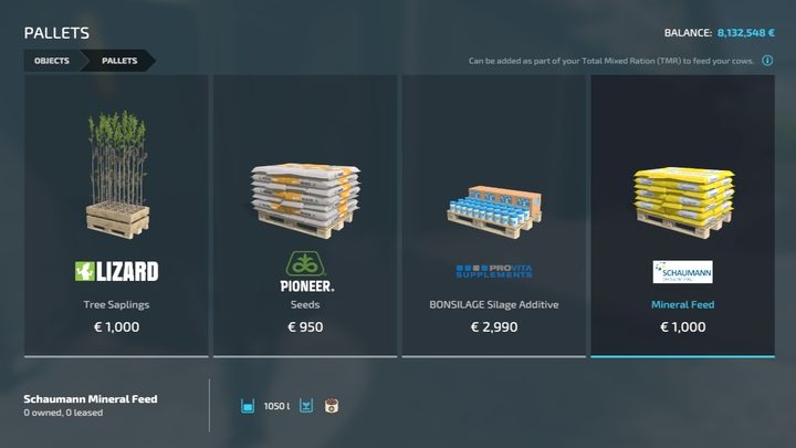 As you can see on the indicators, you can also add mixed feed and straw. In this case, the straw will serve as a feed filler (you will use less hay/chaff), up to 25% of the amount of straw in relation to the rest of the mixture. Mineral feed can also be used as a filler, up to 5% by weight, however it does not affect the feed quality/production efficiency of the cows in any way. You can buy it on a pallet in the store.