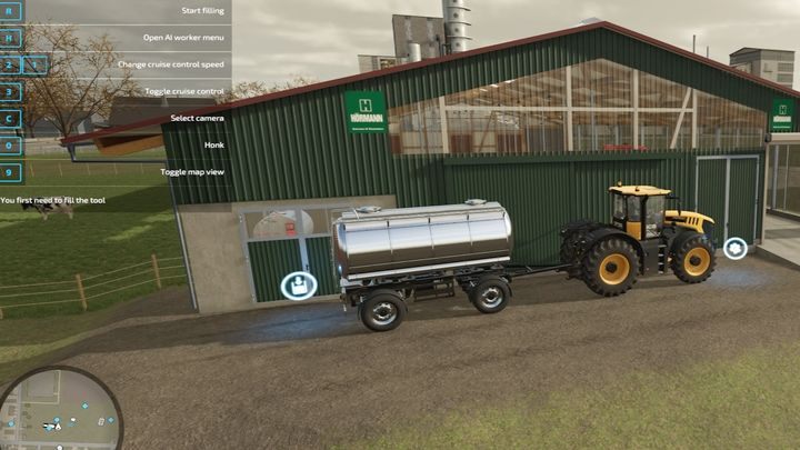 To start filling, place the tank in front of the barn, where you can see the small door and the loading icon. Milk is used in production chains. With its help you will produce cheese, chocolate and butter in the dairy.