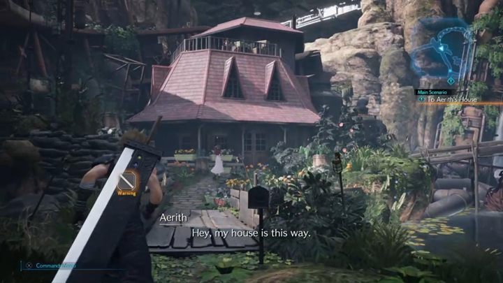 You make it to the next town. Stop and watch the video on the monitor, then go with Aerith to her house.