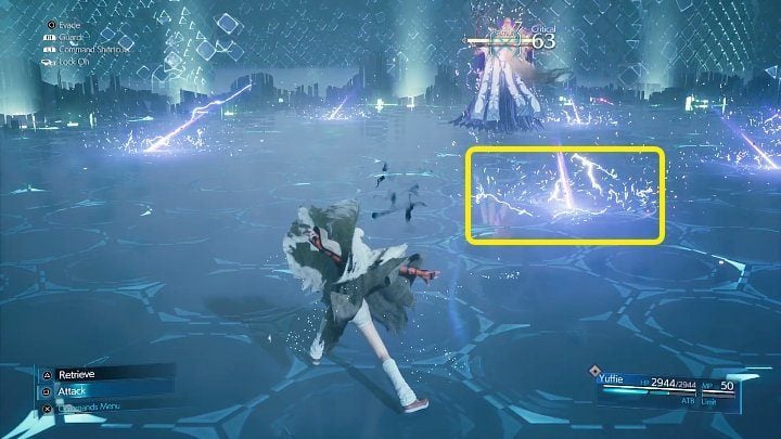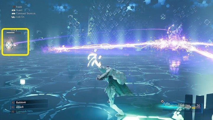 While moving around the arena, watch out for projectiles fired by Ramuh and don't stand in areas covered by a purple static field - if you step on them, Yuffie will be immobilized for a brief moment.
