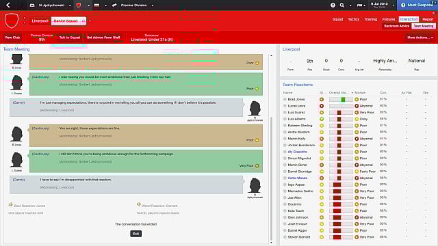 Meetings with the board, assistant, journalists, team and the coaching staff are another important element. They will help you get to know the conditions in the club. You'll get team reports from the assistant, and some hints, often very useful, from the board. Pre-season talk with the team will boost their morale and cheer them on (or the other way, when, for example, you set your goal to "just" qualify for EURO cup when talking to a team that has a chance win a championship - the players might think that you're not ambitious enough). It's a good idea to appear in the media from time to time.