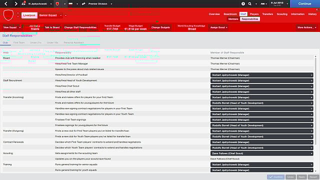 Go to Staff responsibilities under the club menu to decide who's responsible for some tasks in your club. You can delegate some responsibilities (like contract renewals) to your assistants, you can also choose to manage the under 18s team yourself. You should mainly pay attention to the First team tab, where you can command your assistant to participate in conferences, do the pep talks and organize friendly matches.