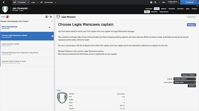 In the beginning of your career in the club and every season you'll be asked to choose a captain. Of course you can change a captain during the game, for example when the current one is seriously injured. To do it, go to Tactics->Captains. Changing the captain may have a negative impact on the team, especially if the previous captain had this title for a long time and has teammates' support. It will, however, have the biggest impact on the previous captain himself. Talking to him and warning about taking away his armband may reduce the negative effects. When choosing a captain, consider player's leadership and determination. The higher these values are, the better the captain.