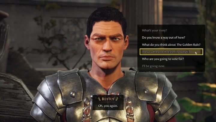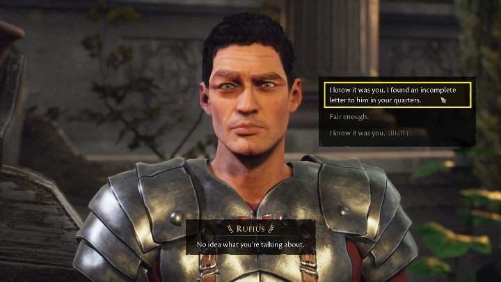 Once you read the letter, everything will become obvious. Time to go to Rufius. He's somewhere near the stairs around the market. You must talk to him in such a way, that you'll be able to use these dialogue options: