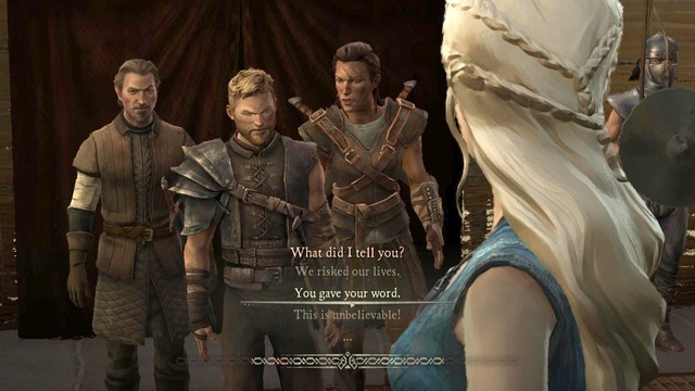 Now the game will take you to Mereen, a city where Asher and Beshka are. This conversation can have various layouts, that depend on a choice that you've made in the previous episode. It was a moment in which Beshka wanted to murder his former master.