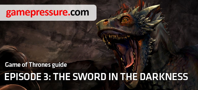 The Sword in the Darkness is the third episode of the adventure game from the Telltale Games studio. The following guide contains the complete walkthrough of the game. In the first chapter of the guide you will find an illustrated walkthrough. The next section of the guide contains the separate description of all the consequential choices that you will have to make throughout the game, as well as their consequences, which you will have to face in the future adventures. Here you will find all the differences between them, as well as their meanings in the future. Game of Thrones A Telltale Games Series - The Lost Lords tells the story of the characters known from the TV series of the book adaptation of Georg R.R. Martin saga. In the game, you will be able to meet characters you've already seen in the first episode, as well as completely new ones, such as John Snow. Your previous decisions may be reflected in this episode, and your approach to the game world will determine the futures of all the characters in the game.