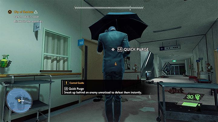 After exploring one of the first corridors, you will have to watch a cut-scene with the Visitors - the game will suggest sneaking (press the crouch button). Approach a Visitor from behind to press the Quick Purge button - a stealth attack. It can kill any weaker opponent instantly or seriously weaken a strong Visitor.