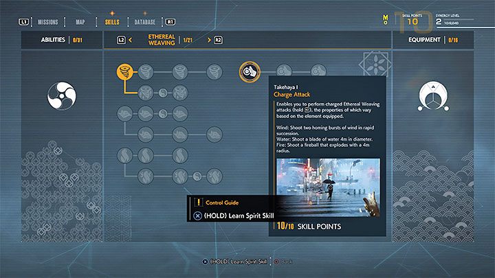 The main character should now level up - increase his synergy level. This triggers a tutorial for spending skill points. You need to acquire the Takehaya I skill - it enables charged attacks for the available powers (you currently have only wind weaving).