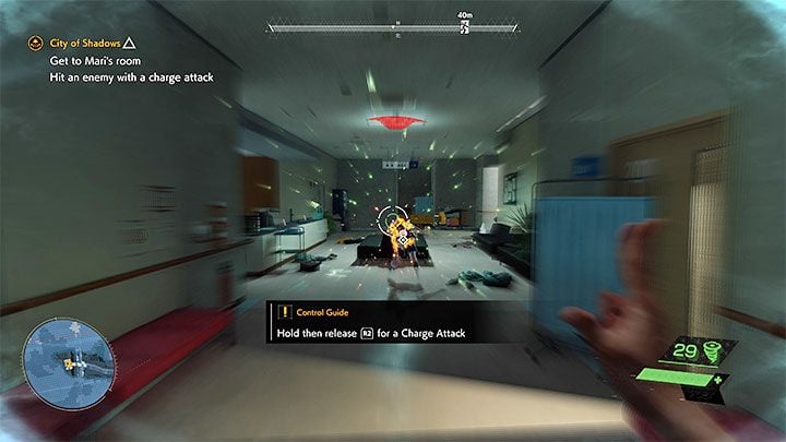 Continue the fairly linear path through the hospital. After encountering a new enemy, you will be able to test charged attacks. It is very simple - hold down the attack button for a few seconds and release it when the weaving (in this case the wind) is fully charged. Depending on the power used, a charged attack can, for example, deal more damage or attack several enemies at the same time.