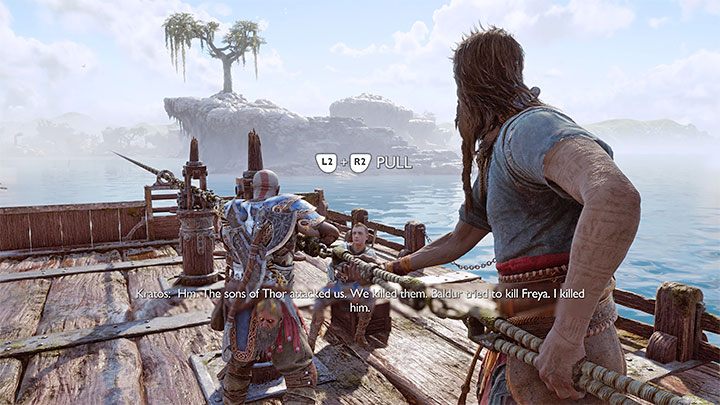 You will fight monsters - use blocks, parries, dodges and Spartan Rage. Reach the top of the new wooden structure. In the place from the picture, you can use the Blades on the big wheel. Pull the Blades to unlock the passage. You can return to the boat.