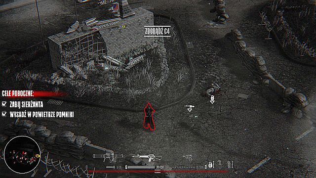 Collect ammo and grenades (and, if there's a need for that, heal your wounds) and head North-West, to the last optional objective for this mission. On your way there you will pass by a lot of buildings resembling barracks, in which you can find a lot of ammo and a bulletproof vest. It's worth to visit them.
