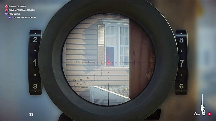 Janus can be shot from the treehouse without any previous preparations, but you have to take the shot at a very specific moment. Take note of the bedroom window of Janus's Property - it is located upstairs and has been shown in the picture above. Janus appears in the window for just a short moment in order to check if there are cigarettes on the bedroom table (you do not have to plant them there). That is when you will see a fragment of Janus's head for a moment, and this is the exact time to take your shot (do not wait for the entirety of Janus's body to be exposed, a moment like that will never appear).