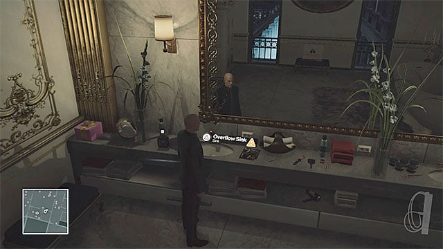 Dalia is always accompanied by her bodyguard, which complicates the task. This can be dealt with by going to the bathroom of the apartment and sabotaging the sink by clogging it, which will cause the water to spill out on the floor. Afterwards, hide and wait for the guard, after which you just have to subdue him (don't let the guard see you in the mirror!) and hide the body in the closet. You might be forced to perform the action twice, as the clogged sink can lure another guard from the room behind the stairs to come into the bathroom. After you've dealt with the guard(s), you can sneak up on Dalia and get rid of her, with, for instance, a garrote.