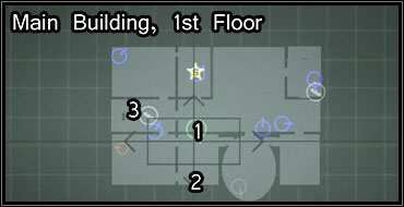 Go through the door (2) and sedate the guard who's patrolling the courtyard. Wear his uniform - now you can walk freely around most of the rooms.