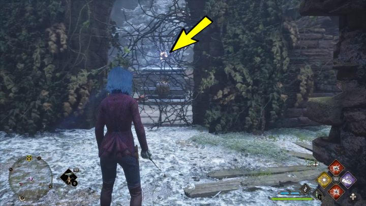 Use a fire spell to remove the vines and go through the arch. Pick up the first object.
