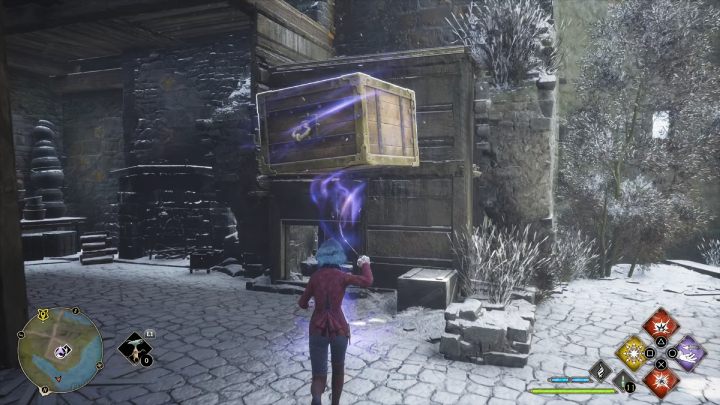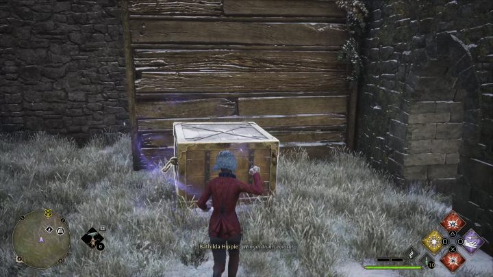 Scan the area and find the chest highlighted in blue . Use Depulso on the planks and use Wingardium Leviosa to move the chest to the castle walls as shown in the screenshot above.