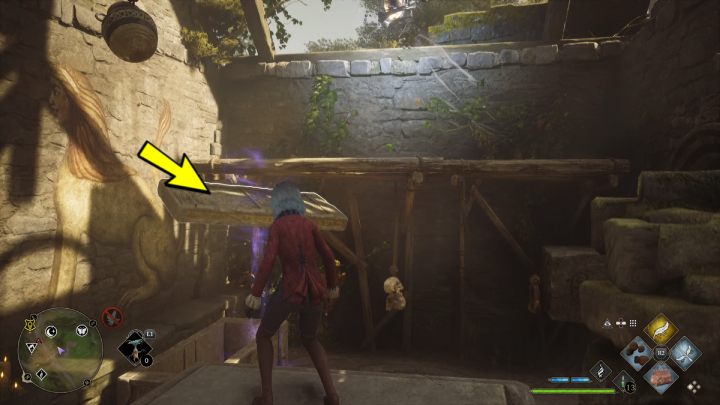 Now move the crate to the vicinity of the table and lift it using Levioso. Climb the crate to access the upper area of the castle. Walk over the planks and pick up the second object.