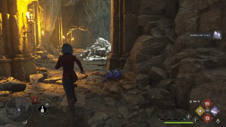 Follow the linear path and jump to the other side near the wall with torches. Remove the boards on the left with Accio and jump down.