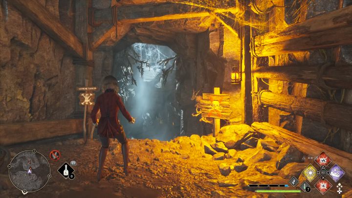 Enter the mine, go straight and turn left. Jump to the other side and follow the path. Jump up and slide down at the signs.