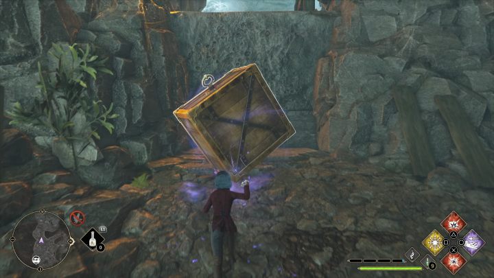 Go back to the previous room and use Accio spell to move the box. Jump up and go straight all the time. Go down.