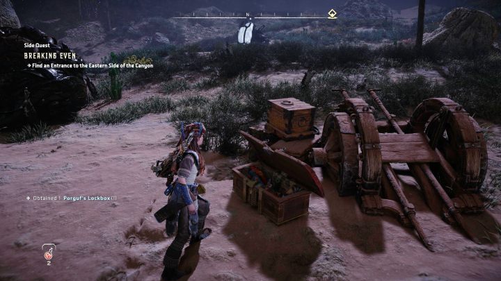 Scan the area thoroughly and search all the chests which contain many valuable items. Porguf's lockbox is by the wooden cart.