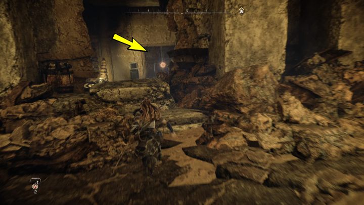 Go to the tunnel next to Camp Nowhere and set fire to the Firegleam. Then pull the grid from the wall using the pullcaster and proceed to the next room. Approach the lying woman and talk to her.