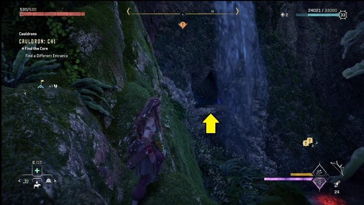 This time, the path forward doesn't lead through the cauldron gate. You need to climb the rock on the right and look towards the waterfall. You should see a nearby cave. Climb up there and go inside.
