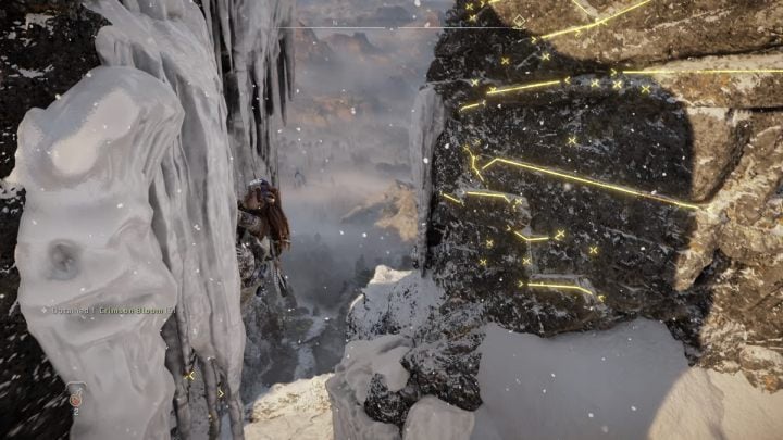 Jump over to the adjacent rock and continue climbing. Jump over the rock on the left by the crate and enter an area where grass sticks out of the snow. Go up, scan your surroundings, and pull yourself to the next grip.