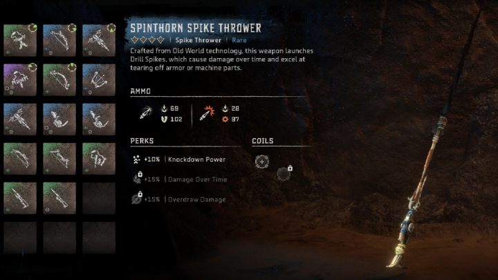 Finally, approach the workbench and craft weapons from the resources you found. The Spinthorn Spike Thrower has tremendous knockdown power and explosive ammunition. It has 4 upgrade levels and 2 coil slots.