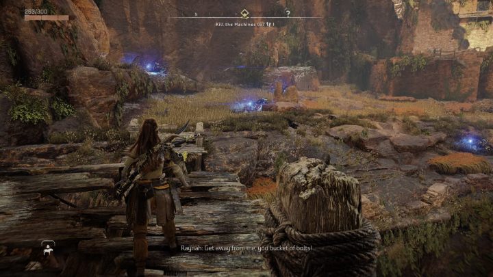 Standing at the end of the bridge you can easily shoot down all the machines. After eliminating the threat, jump to the other side by grabbing the yellow handle on the broken bridge and talk to the woman sitting on the rock. Raynah will ask you to bring her the lens from the tower.