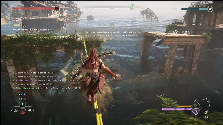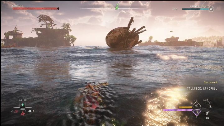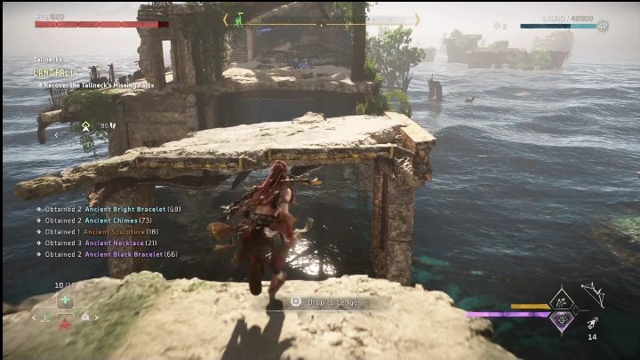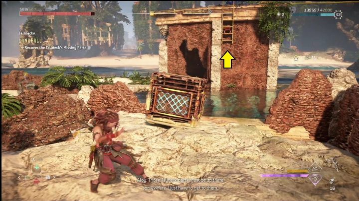 After scanning the Tallneck, you will need to collect the two parts. It's not difficult. Simply climb the ruins, push the crate into the water, and shoot down the blockade on the ladder. Then jump on it and climb to the top.