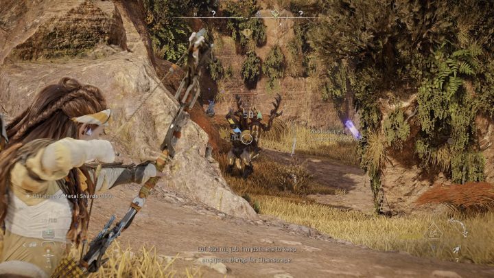 Outside the camp you'll encounter some machines attacking the refugees. Scan the machines to tag their weak points and try to shoot them off with your bow. The battlefield also contains several traps you can lead the machines into. After the battle search the machine wrecks for some materials.