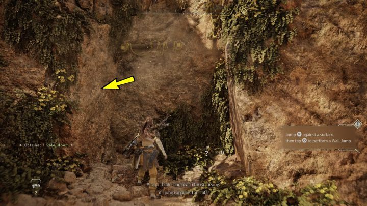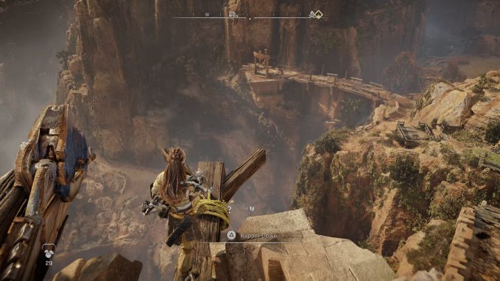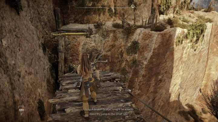 Jump off the bridge and press X to grab the object marked on the screen. Scan your surroundings and move to the right on the rock. Then climb up by the wooden planks.