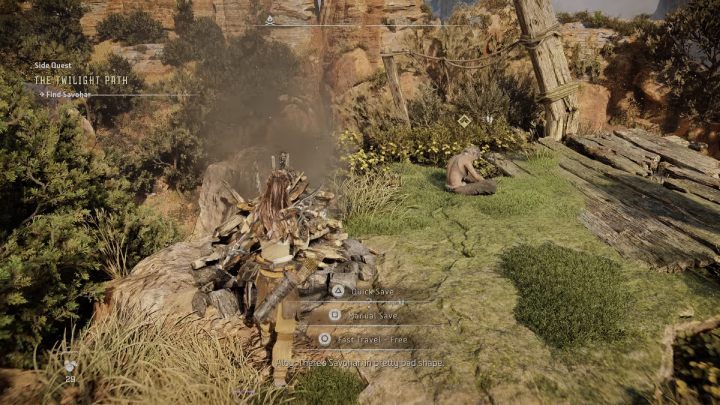 Make a running jump over the broken bridge and move along the rock wall. You'll see blood on the path. Press R3 to activate your Focus, then tag Savohar's blood trail with R1 and follow them.