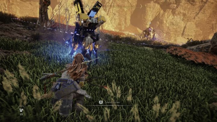 Go to the back of the canyon through the tall grass. Wait for the Ravagers to move away to a safe distance and then hit the Fanghorn with a silent strike. If the strike does not kill the machine, quickly kill it with your spear and immediately hide in the grass. Then wait for the alerted machines to return to their tasks and eliminate the second Fanghorn in the same way.