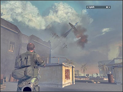 Make sure that both BTRs have been disabled. Pick up a new rocket launcher and try to memorize where to find other weapons of this kind. An enemy gunship will arrive here in a short while. I wouldn't recommend attacking it right away. Instead, wait for a new mission objective to be displayed on your screen. You will also have to find a good cover for Lynch, because he can't help you here and otherwise you'd probably lose him.