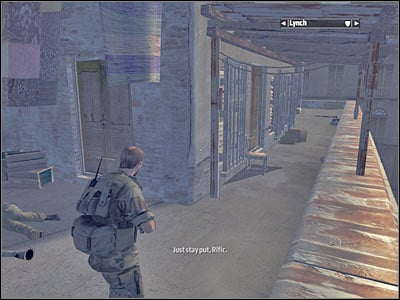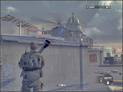 Don't forget about taking care of Lynch. Look at the screen - this seems to be the best possible hideout for him. I wouldn't recommend trying to give him a rocket launcher. You will also have to deal with a single sniper. He will appear on a roof of a nearby building. Wait for the helicopter to get back here.