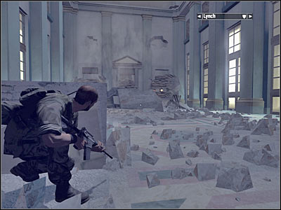 Head on to your right. You will have to kill two members of The7 organization. They're heavily fortified, so obviously it won't be easy to get rid of them. Don't worry about an unusual filter, because it won't interrupt your approach. Let's start by hiding Lynch. Order him to stand behind a large concrete object (screen).