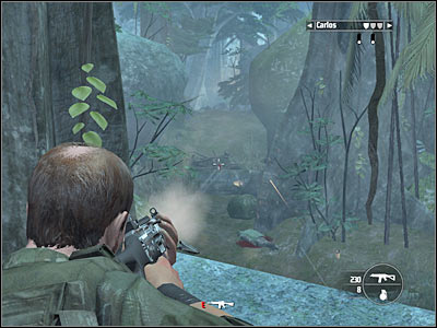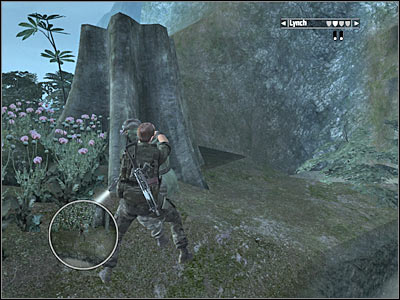 Make sure you've reached the lower section of the waterfall safely. Start moving towards a large tree. Hide there and wait for one of the enemy soldiers to show up. Get closer to him without being spotted. Obviously you will have to neutralize him with a melee move. Order your teammates to get here. You will have to remain unnoticed, so wait patiently for them to join you.