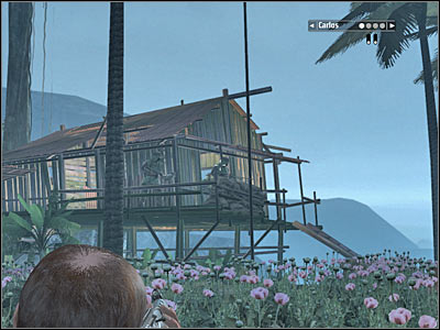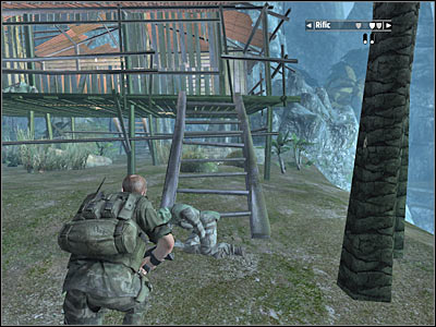 It would be a good idea to move closer to the hut. Use the stairs (screen) to get to a smaller balcony. You should also consider taking a rifle from one of the killed soldiers. Secure the hut by making sure no one's inside.