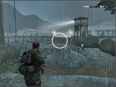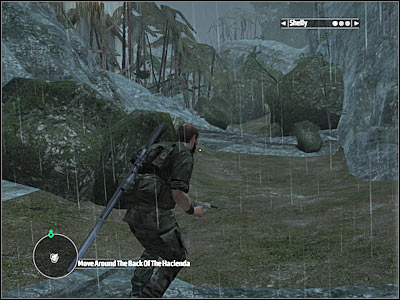 You've got two choices here. I've already said that you would be allowed to sneak your way into the hacienda. If you want to stay out of sight for as long as it takes, you will only have to kill a single enemy soldier. He will be standing beneath you (screen).