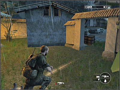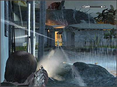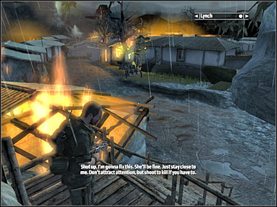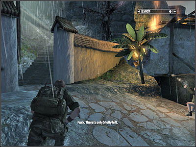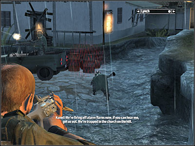 Keep heading towards the church. You will have to prevent enemy soldiers from harming you or someone from your team. Thankfully, you won't have to secure this entire area right now. Focus only on getting to your target. You will have to find an entrance which leads to the stairs (screen). Wait for Lynch and Jenny to arrive before moving on any further.