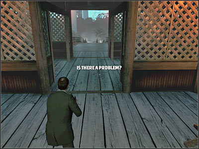 Keep heading towards the pagoda. Once you're close enough, you will probably notice that your bodyguards have stayed behind. Head on forward. You will have to enter this small building. Locate a cell phone and press the E action key in order to use it. You will have to watch a new cut-scene. Lynch will once again lose control over his actions and he'll shoot the hostage. As a result, you will have to go into defence, because you're going to be attacked by Retomoto's thugs.