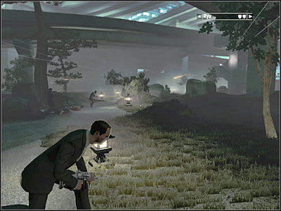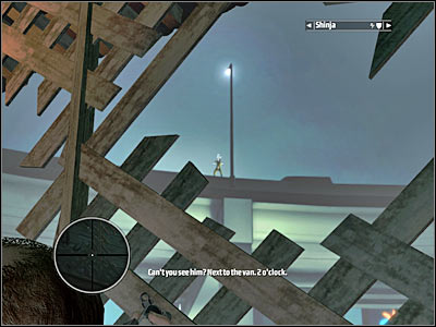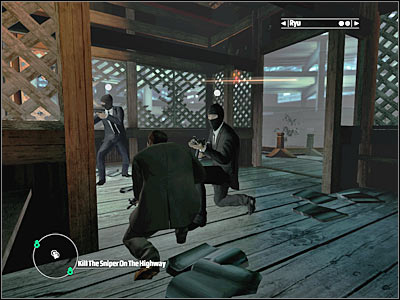 You should consider pressing the M key. This should allow you to add new icons to your compass. As a result, you will be able to assist Lynch in finding the snipers. Make sure you're facing one of the icons, so you won't have any problems locating your enemy (screen). Both snipers will be standing near the freeway. Once you've located each of them, press 2 in order to mark a target for Lynch. You will have to use these tactics to take out both snipers. Make sure it's done quickly, so you won't have to hide inside the pagoda for too long.